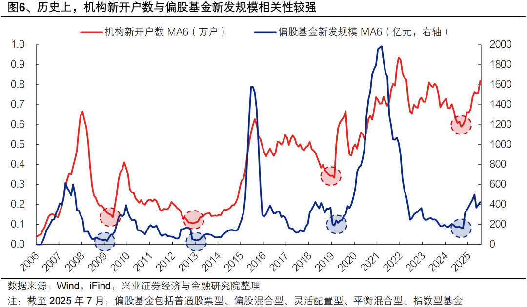 往后看,机构开户眷注增长下,权益基金新发有望赓续改善。历史上机构新开户数与权益基金新发范围权臣正研究。机构开户眷注增长下,后续权益基金新发有望赓续改善。资产端与欠债端的正反馈有望冉冉形成,新一轮“机构牛”或已在途。