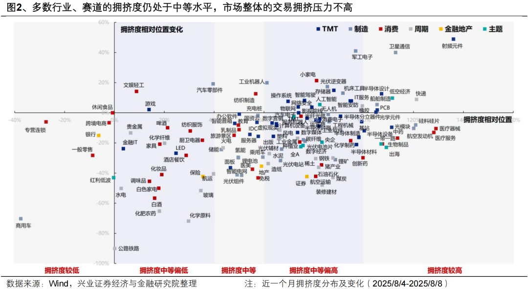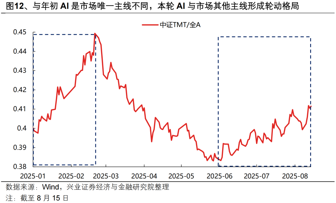 外部“大轮动”:本轮AI与阛阓其他干线形成轮动花式。与年头AI行动阛阓唯独干线的情况不同,本轮AI与窜改药、军工等其他成长干线,以及“反内卷”等顺周期干线形成轮动花式。这使得AI板块短期内相对阛阓未积贮过多逾额收益,也莫得眩惑过多流动性,因此行情举座走势更为健康可不时。