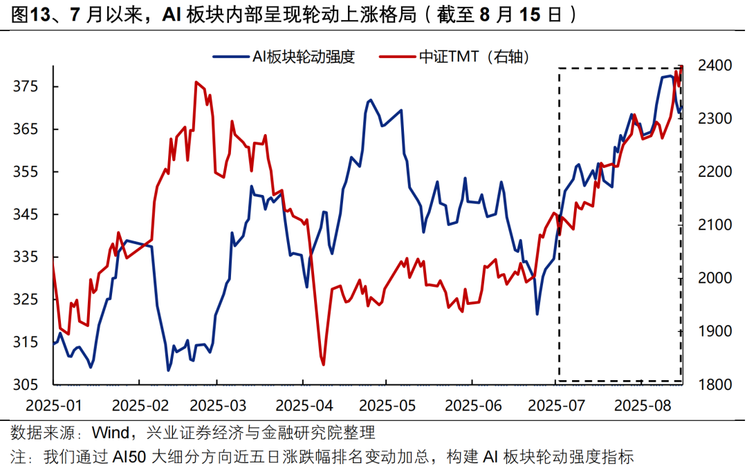 里面“小轮动”:7月以来AI里面形成轮动高涨花式。年头的那轮AI行情中,尽管行情举座向更多中下流板块扩散,但阛阓共鸣围聚在少数强势板块,带动AI板块轮动强度不时着落的同期,行情也很快堕入“过热”状态。而本轮AI行情自7月以来,已从6月北好意思算力链的“轶群出众”冉冉扩散至国产算力、中下流讹诈等低位地点,通过里面轮动与高下切换的花样消化部分板块的短期过眷注绪,最终在里面轮动高涨中竣事了板块举座的新高。