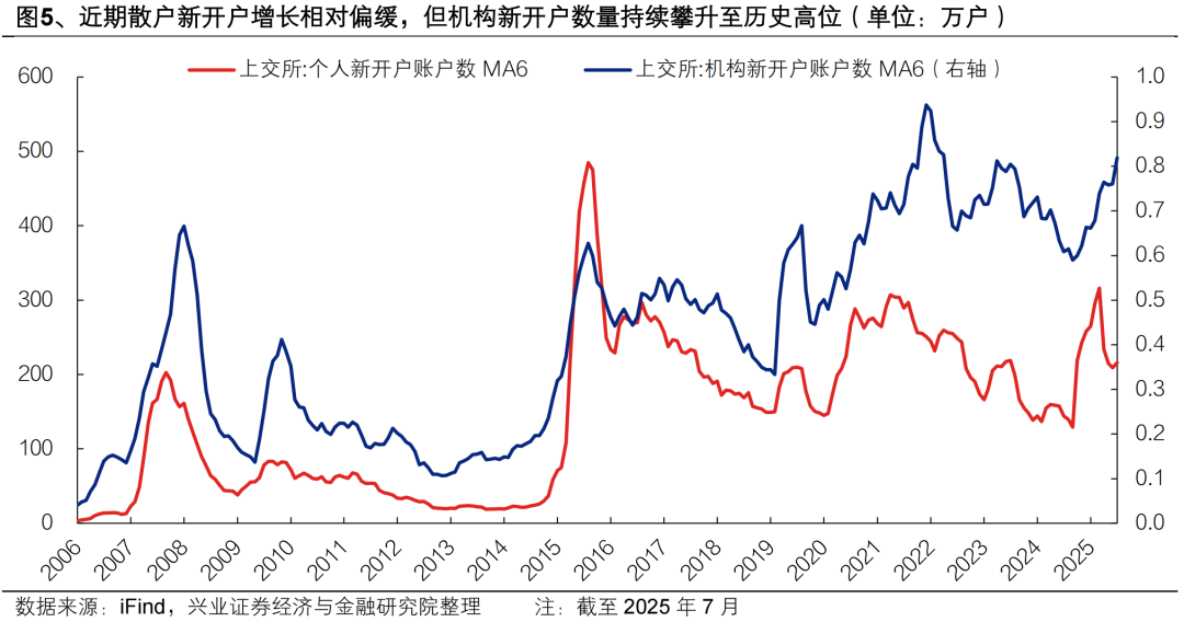 因此,咱们看到机构正在成为本轮增量资金的主力。6月以来,散户新增开户数相较年头科技行情和昨年“924”行情增长相对偏缓,但机构新增开户数不时攀升至历史高位,基本复原至2021年的高位水平。