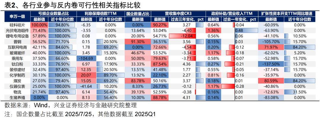 建树上,咱们从参与反内卷的遑急性(耗损企业数目占比&利息保障倍数)、反内卷试验的不时性(围聚度变化趋势&国有企业数目占比),以及产能去化的阻力(政府扶助力度变化趋势&延长性成本开支强度)等三个维度分析哪些行业具备更好的反内卷基础。