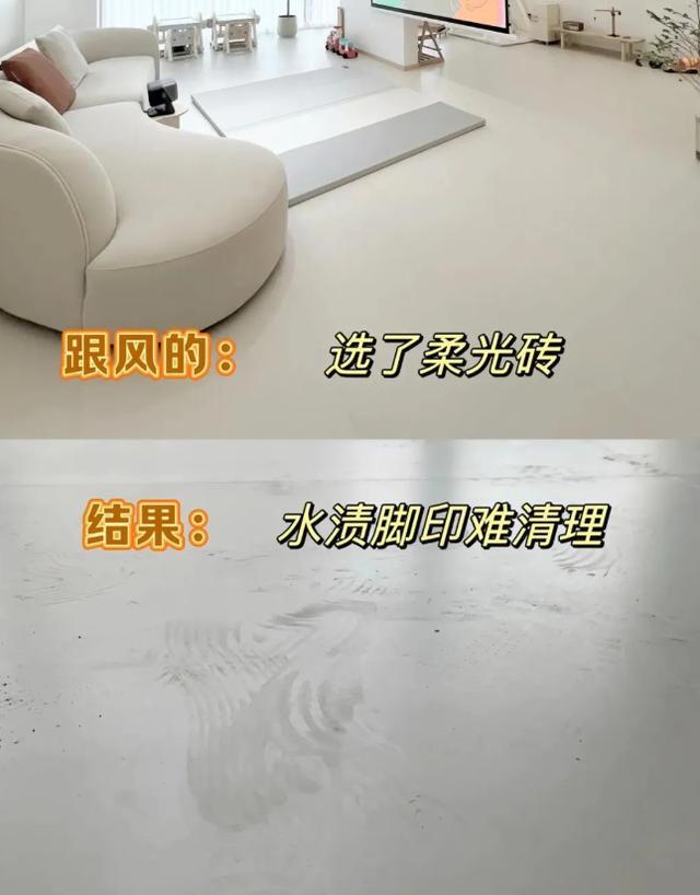 在选瓷砖是首选光线轻柔的柔光砖,殊不知,装了柔光砖的东说念主也会后悔,这是因为在骨子讹诈的经由中,多样水渍和脚印难以清算的问题会让高颜值的柔光砖好意思貌打折。